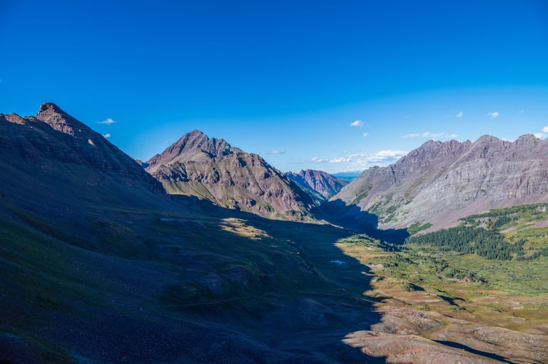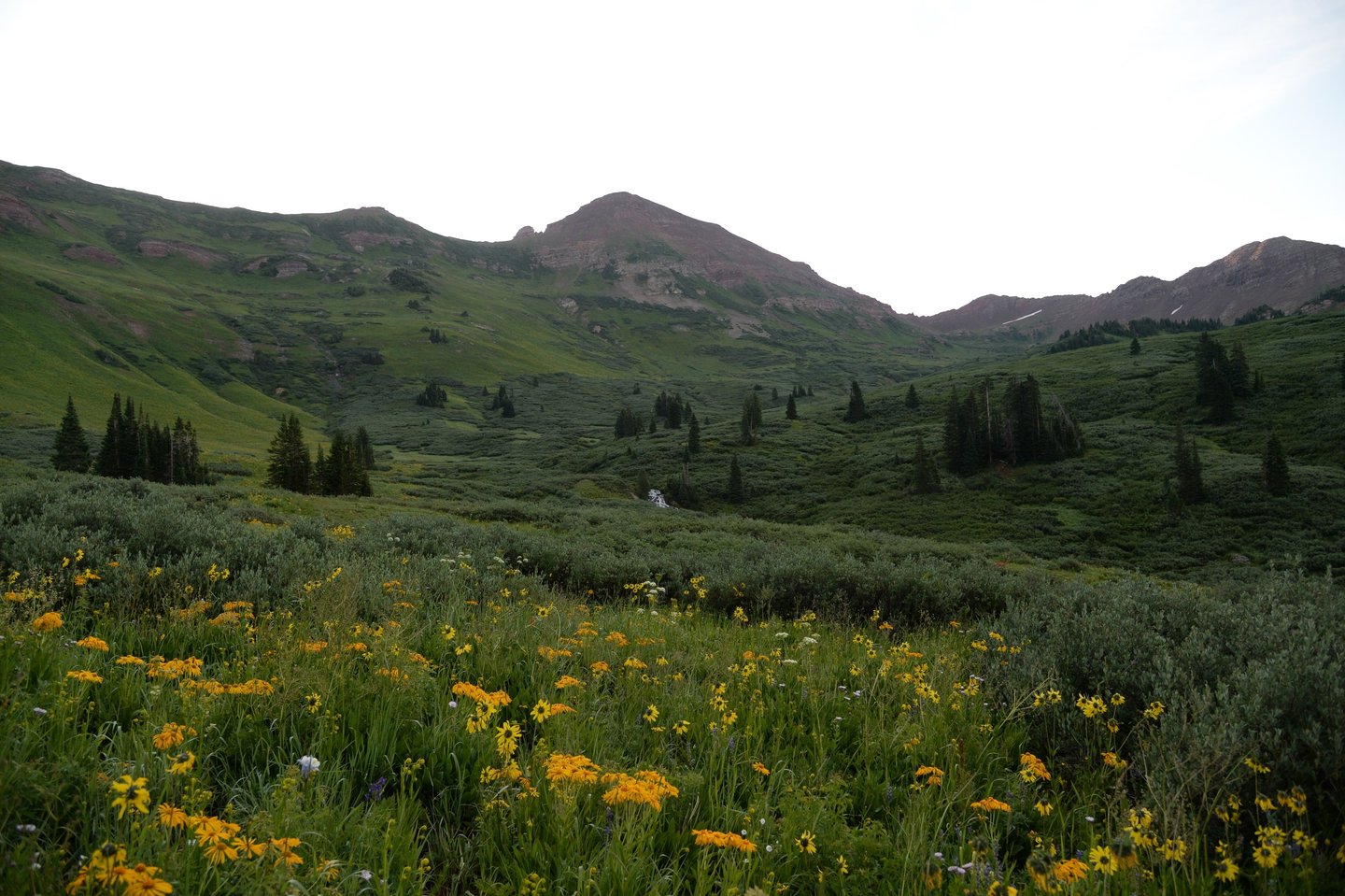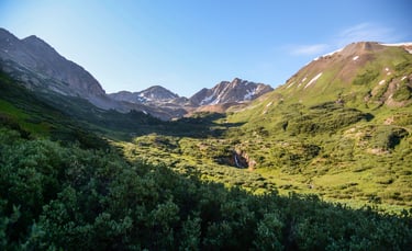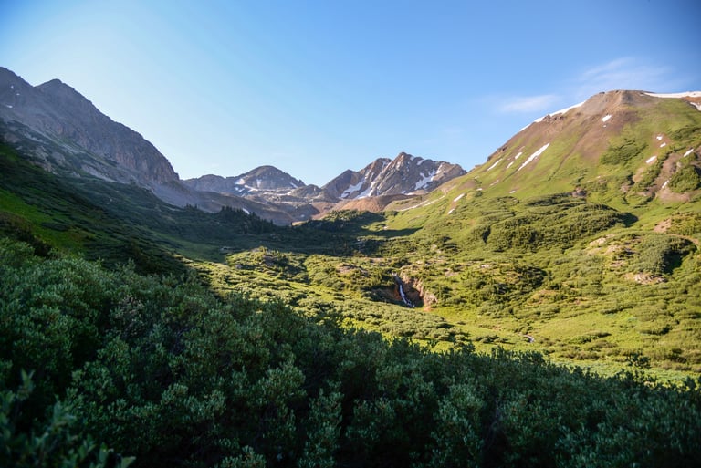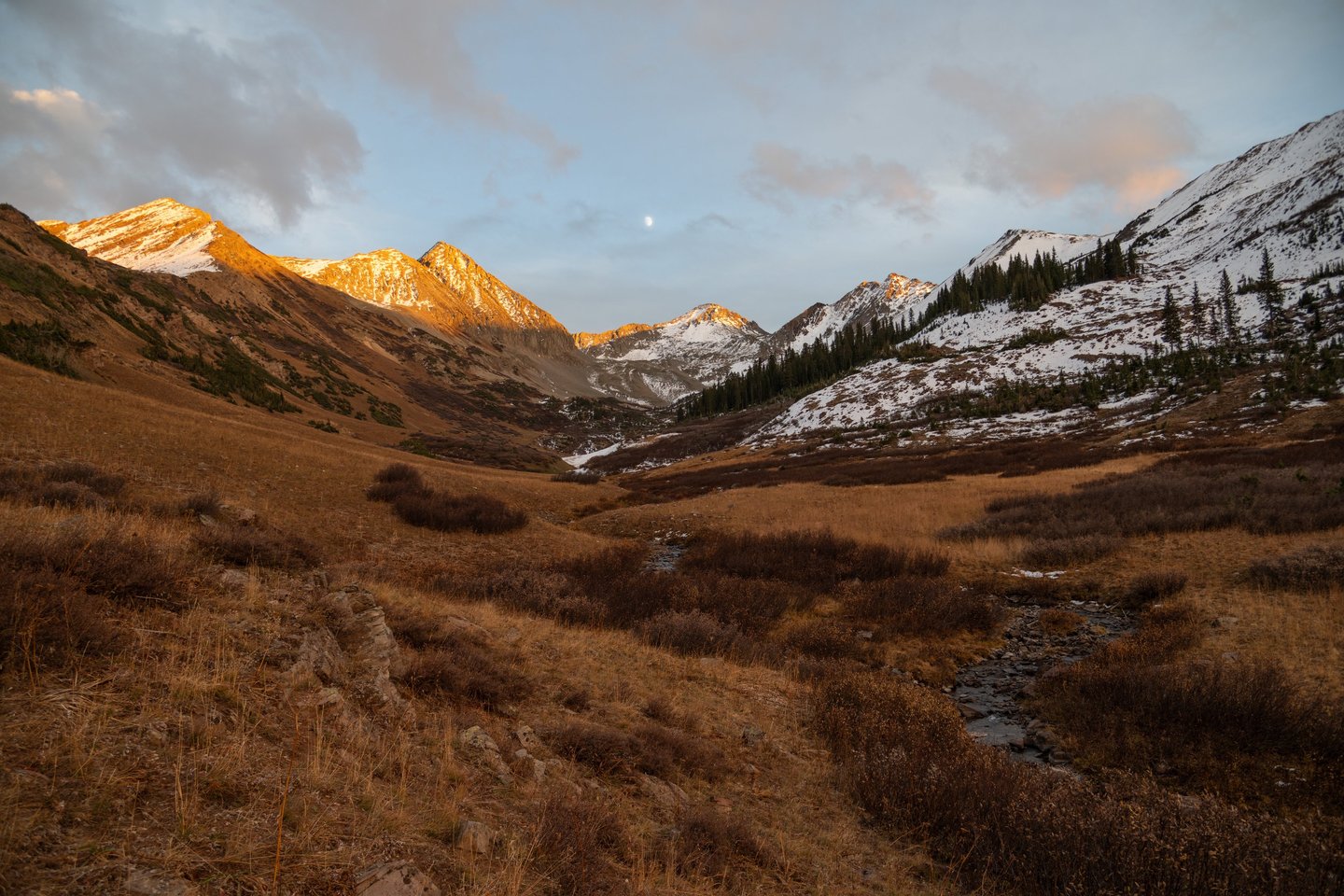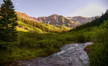 Sunrise in lower Rustlers Gulch Basin on a summer morning. Bright sunlight shines on unnamed peaks that rise to 12,600 feet, separating West Maroon Pass valley and Rustlers Gulch basin. Rustlers Gulch flows through the basin filled with lush grasses and wildflowers that later in the summer paint the basin floor with vibrant color.