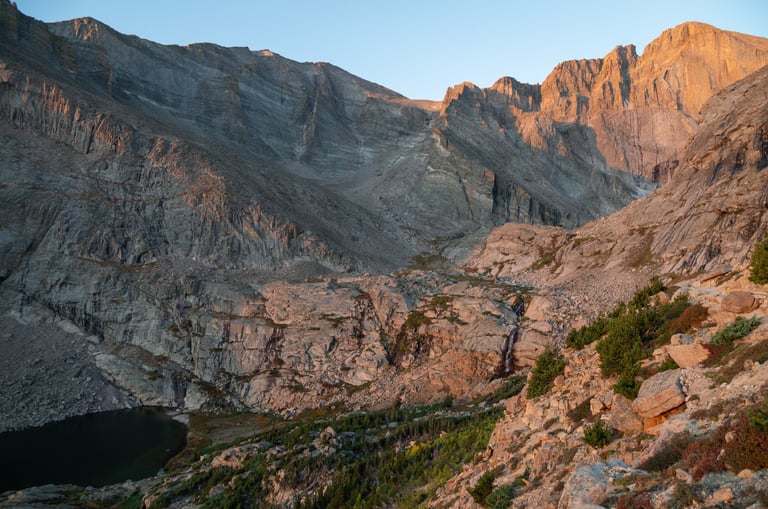 The spectacular upper basin of Rustlers Gulch in brilliant early morning sunlight. Rustlers Gulch falls down through the lush valley below Precarious Peak and the unnamed peaks of the basin wall.